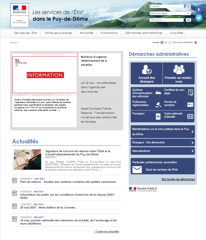 capture d’écran du site de la préfecture du Puy de Dôme au 5 juin 2021 – 20 h 20