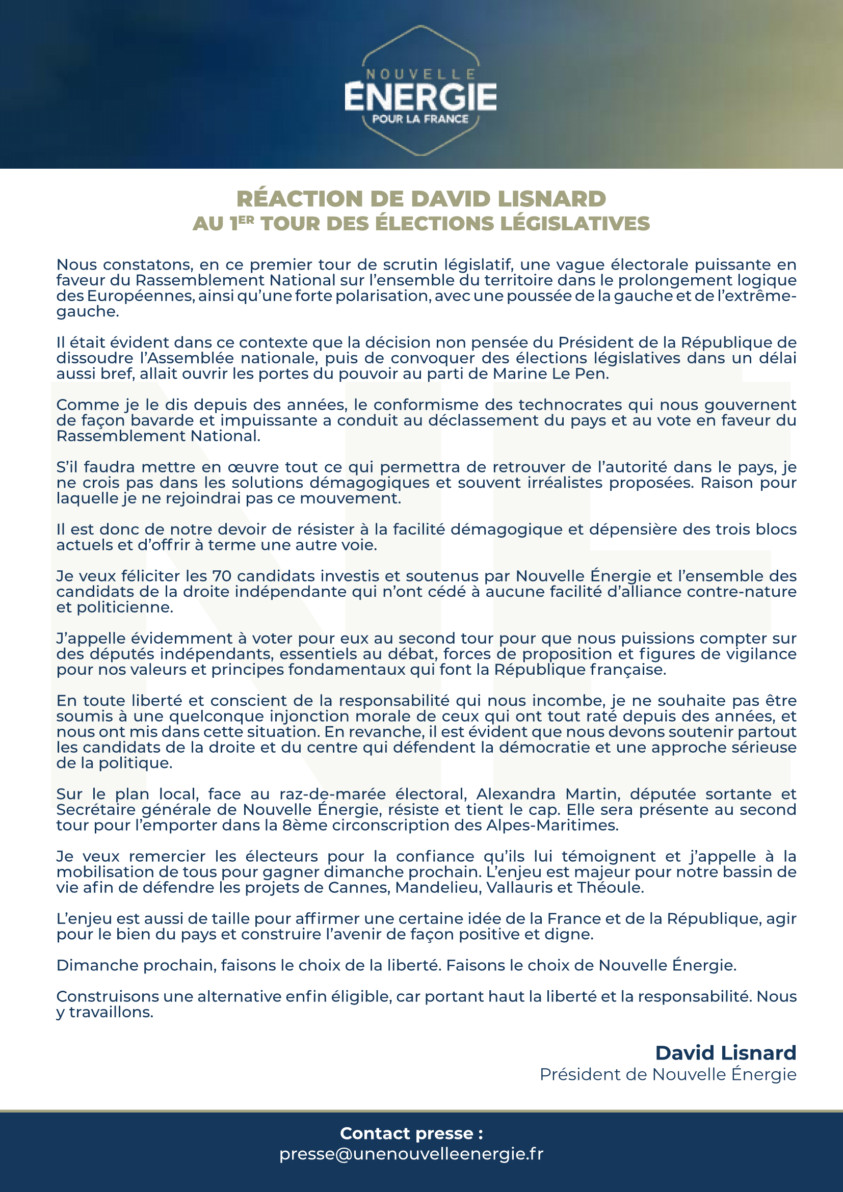 1er tour des législatives : réaction de Nouvelle Energie pour la France.